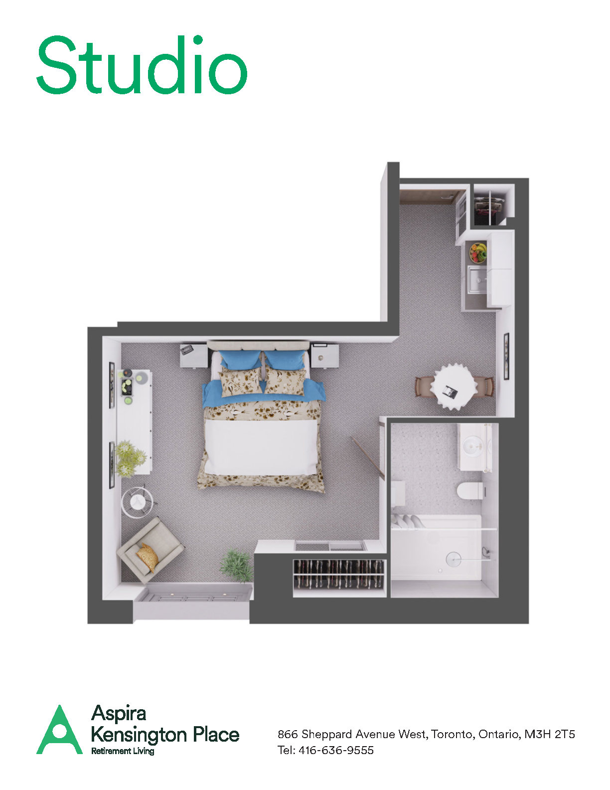 Compact and comfortable, the studio suites at Kensington Place are ideal for those who prefer a cozy space with access to all community amenities and services.